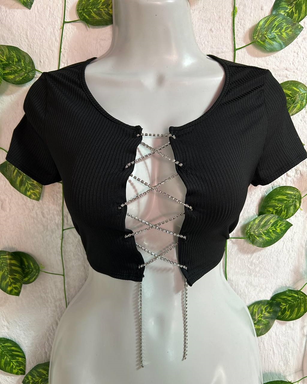 Укороченная кофточка с цепочкой со стразами черный
