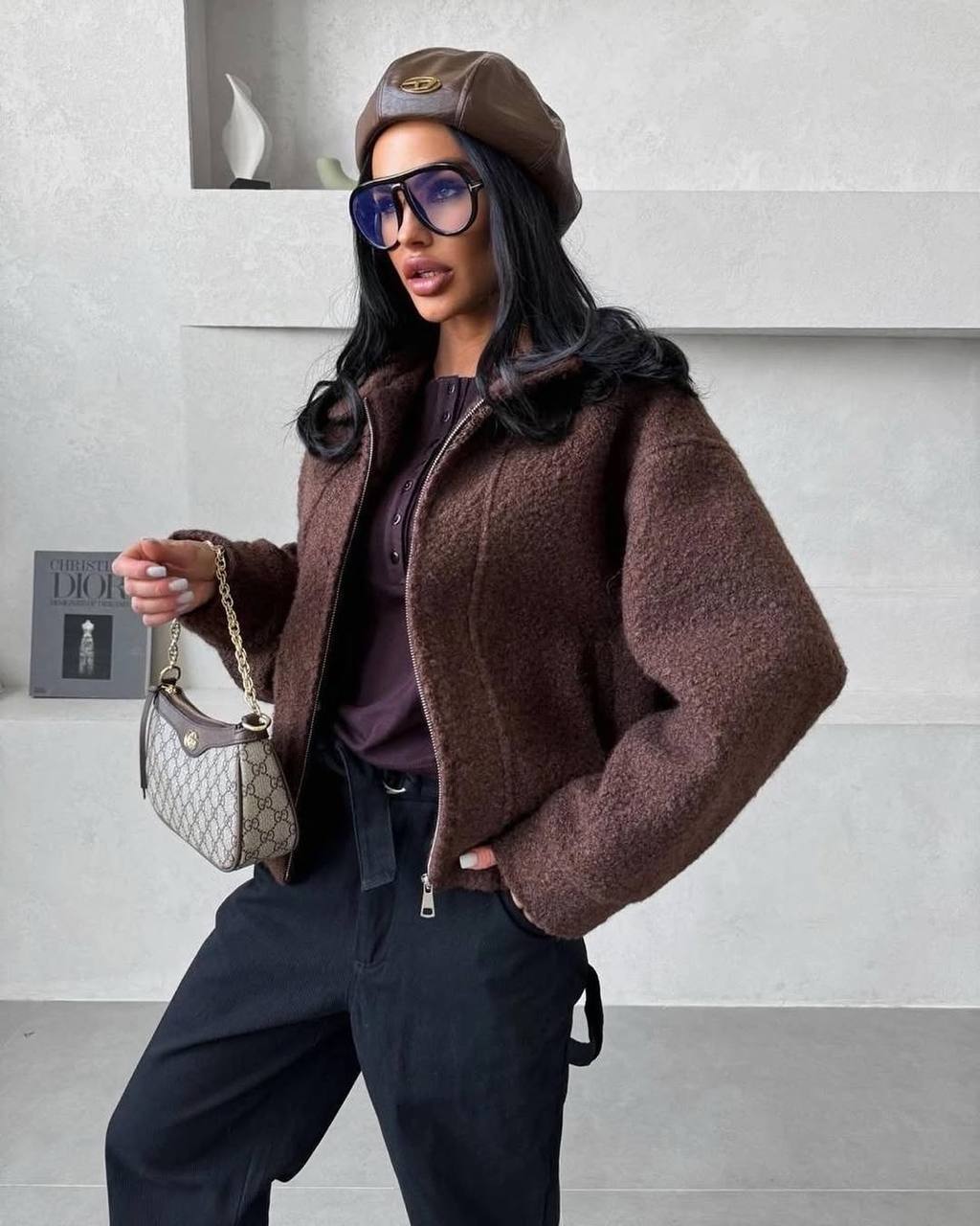 Стильная укороченная куртка из ткани барашек букле. Имеет мягкую фактуру и приятную на ощупь поверхность. Изделие выполнено на подкладке, что обеспечивает комфорт и удобство в носке. Куртка застегивается на молнию, имеет воротник-стойкий и удобные боковые карманы. Низ и рукава слегка прибраны на резинку, придающую изделию аккуратную форму.