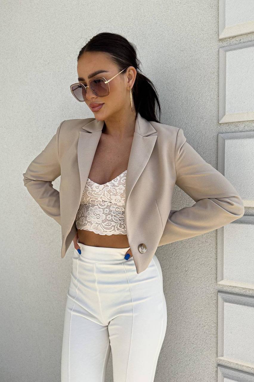 Головна » Магазин » Одяг » Куртки сорочки » Укороченный пиджак с пуговицей (костюмка) беж