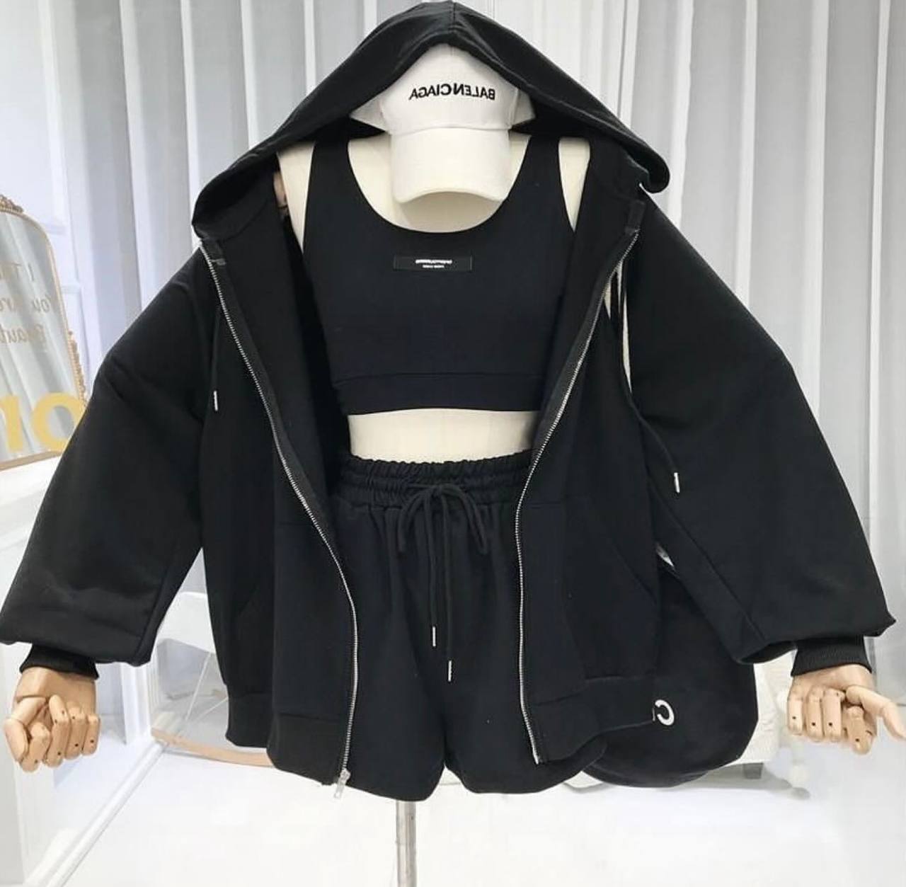 Будьте першим, хто залишив відгук “Универсальный спортивный костюм тройка: удлиненная худи+топ+шорты черный”“