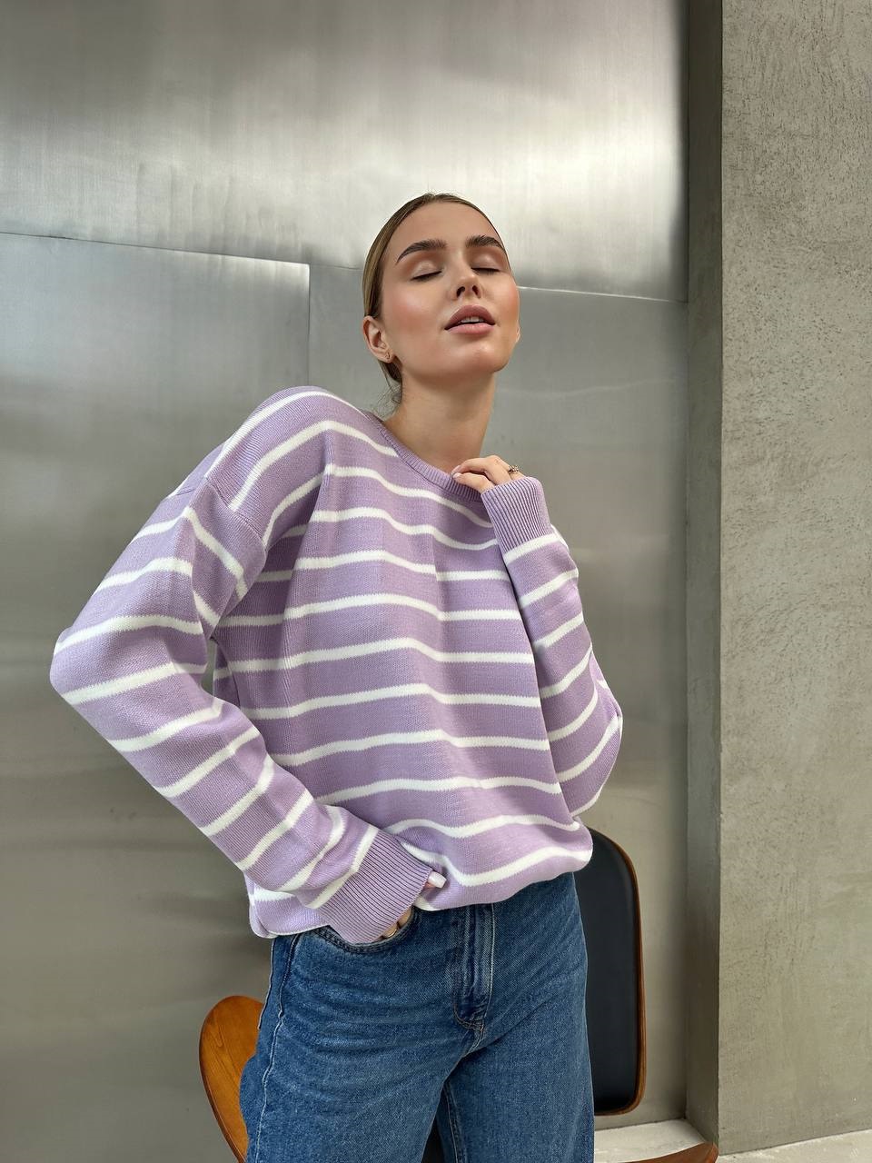 Уютный свитерок в полоску с круглой горловиной лаванда