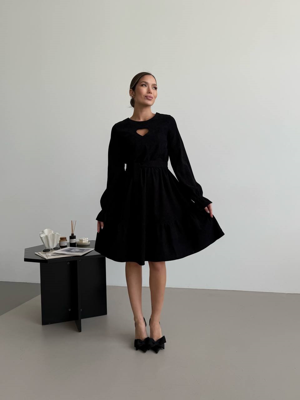 Вельветовое платье с поясом+изящный вырез в форме сердца на груди+воланом по низу черный