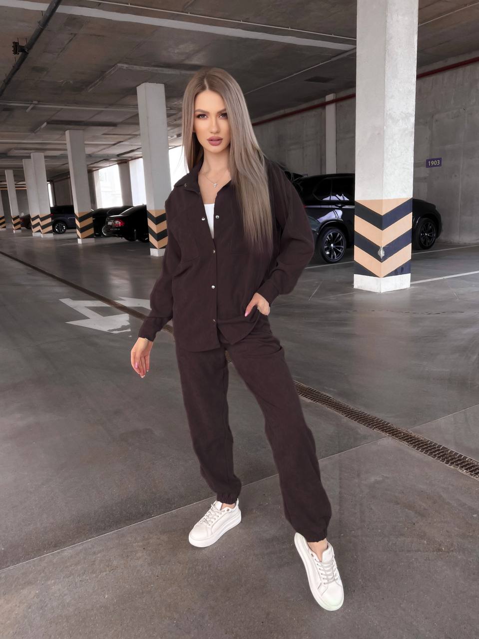 Вельветовый брючный костюм: рубашка на кнопках+штаны с карманами шоколад