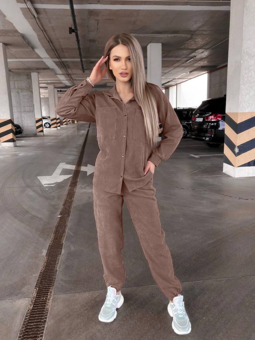 Вельветовый брючный костюм: рубашка на кнопках+штаны с карманами мокко