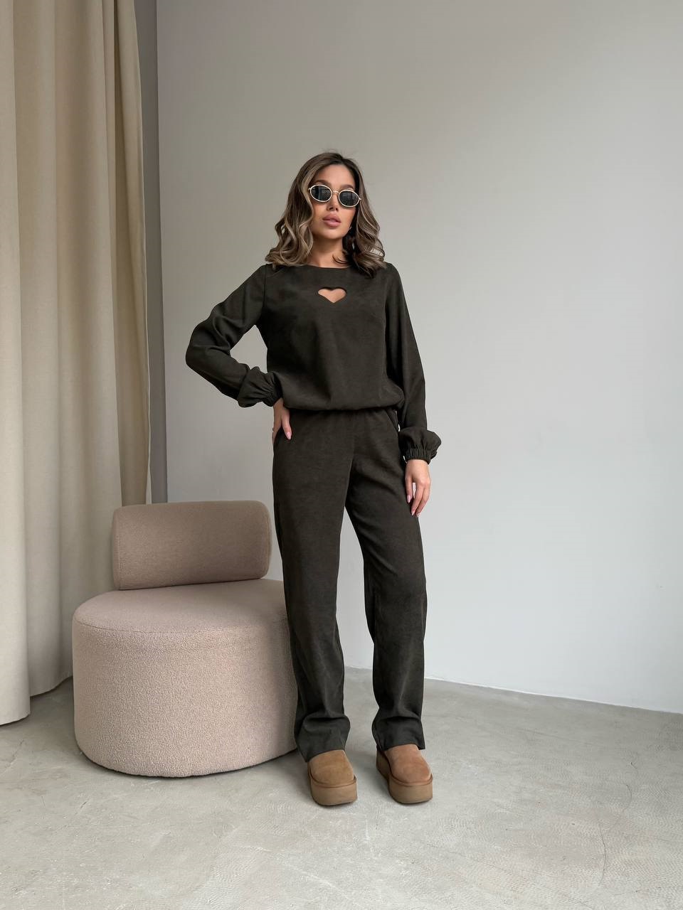 Представляем вельветовый костюм, состоящий из кофты с вырезом в форме сердечка и прямых брюк на эластичном поясе.