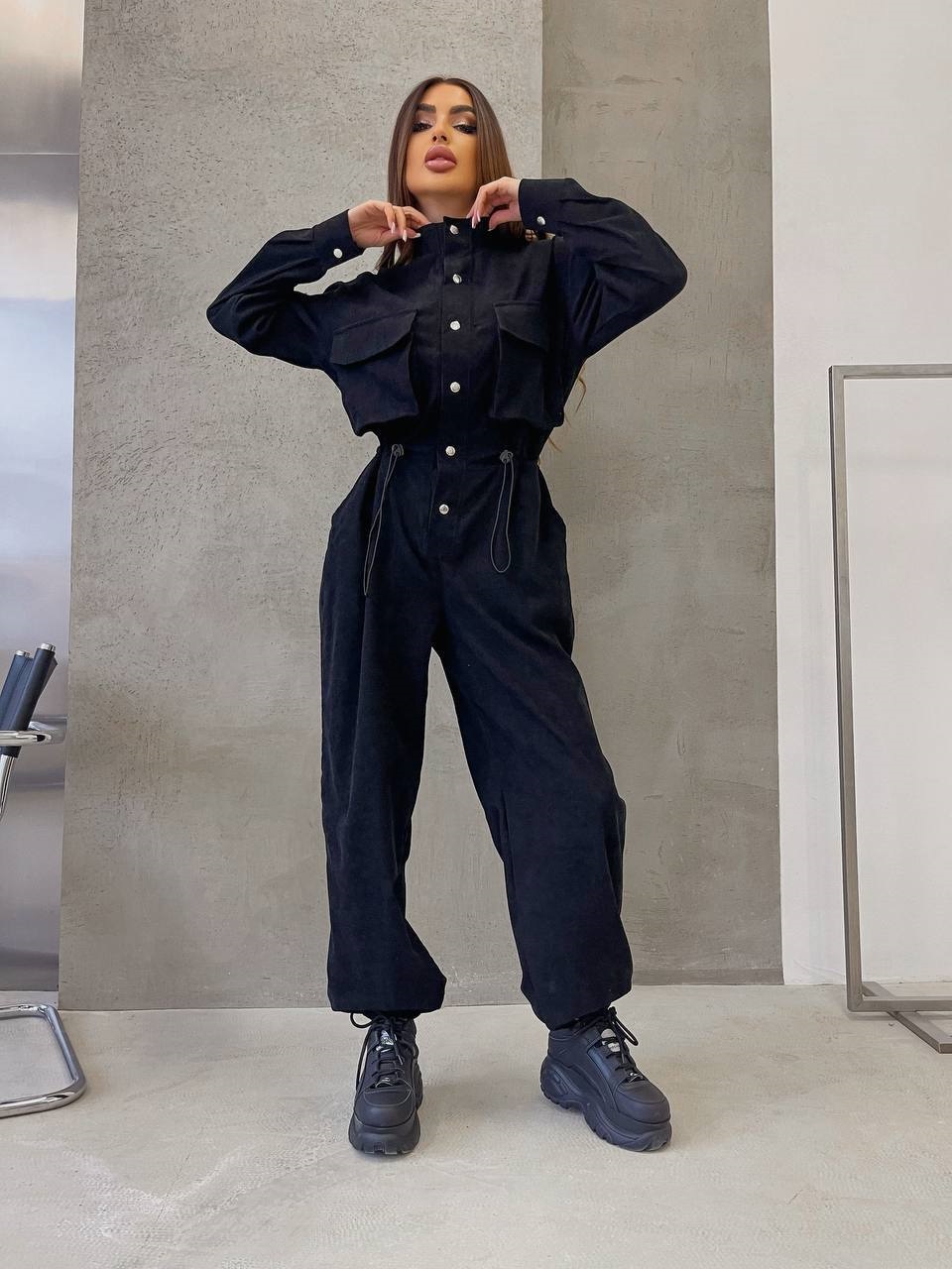 Вельветовый молодежный комбинезон на кнопках+по талии резинка+на брюках манжета с резинкой черный