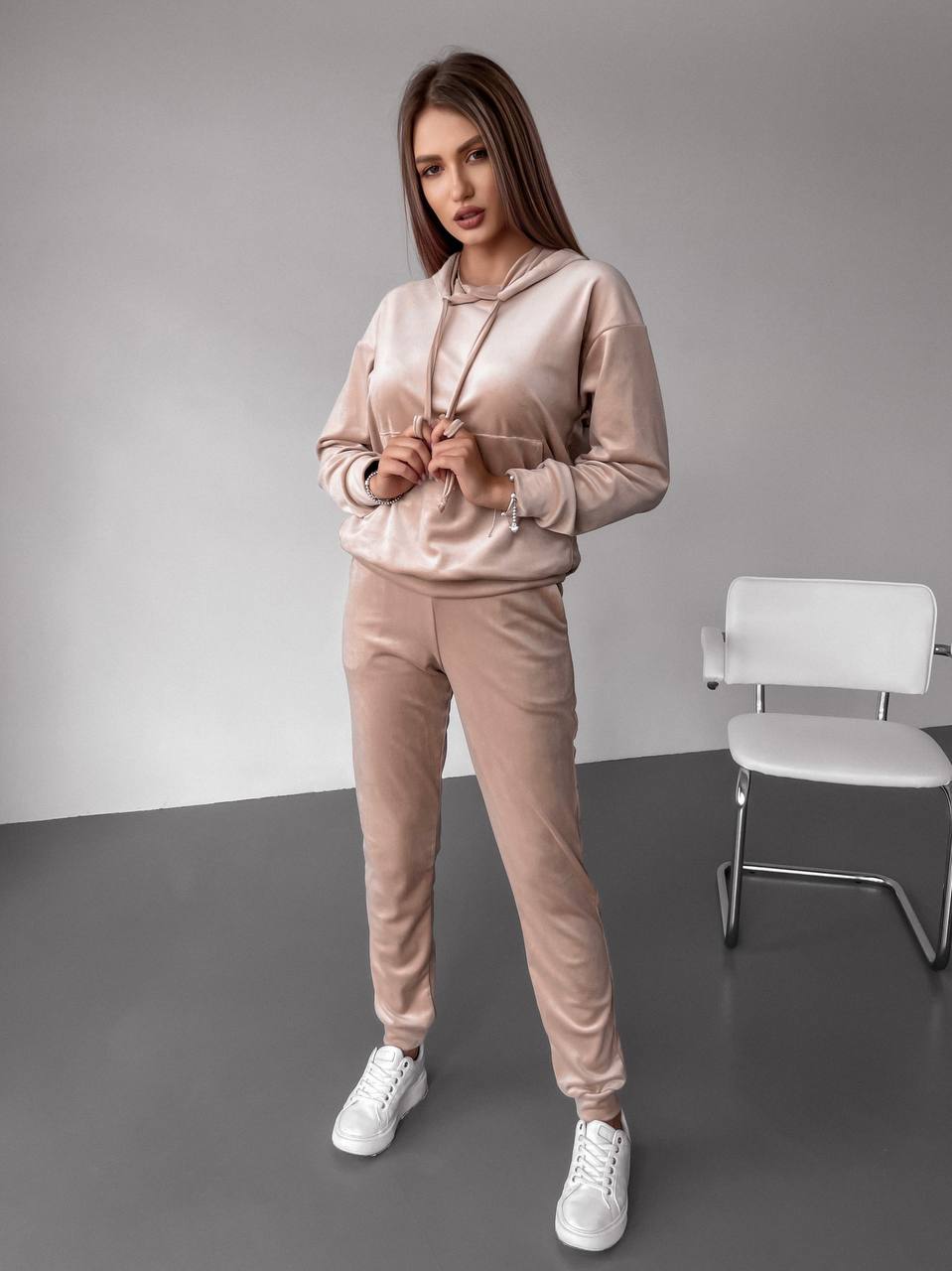 Велюровый базовый костюм: кофта с капюшоном с завязкой и карманом кенгуру+штаны с карманами бежевый