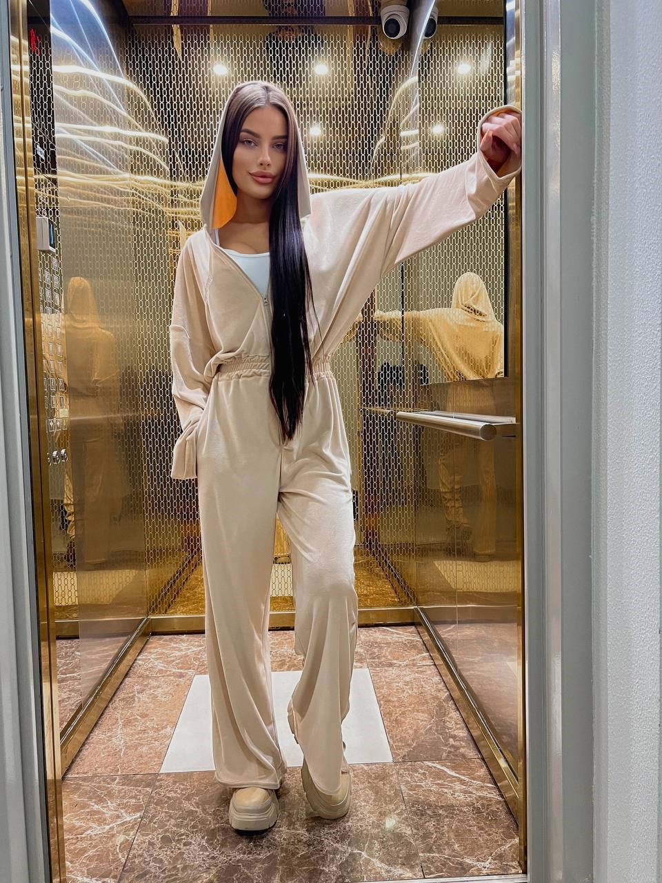 Велюровый комбинезон (кофта с капюшоном на молнии+свободные брюки) бежевый