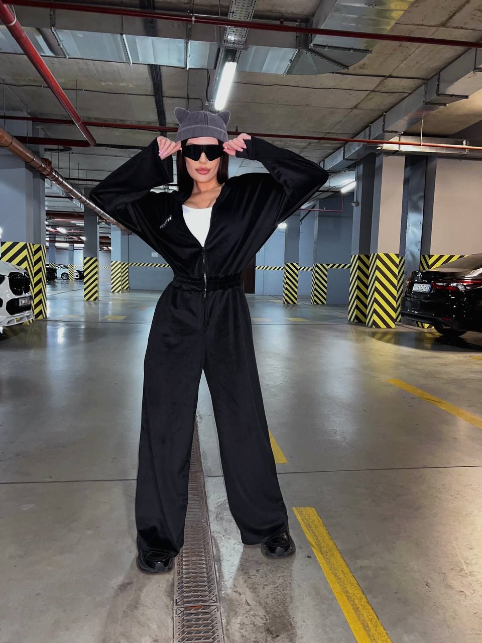 Велюровый комбинезон (кофта с капюшоном на молнии+свободные брюки) черный