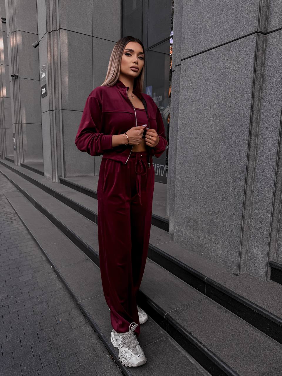 Велюровый костюм двойка: кофта со спущенным рукавом+брюки с высокой посадкой марсал