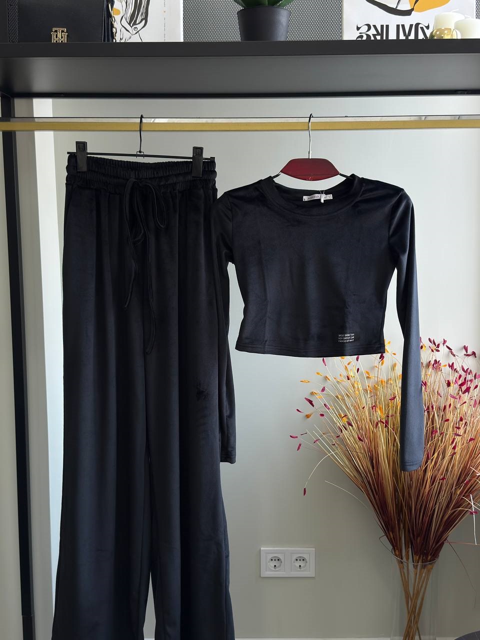 Головна » Магазин » Одяг » Жіночі спортивні костюми » Велюровый костюм (футболка с длинным рукавом+свободные брюки) черный