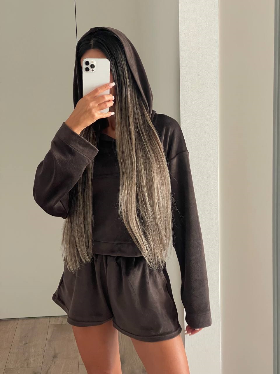 Головна » Магазин » Одяг » Жіночі костюми » Велюровый Костюм (худи с объемным капюшоном+шорты) шоколад