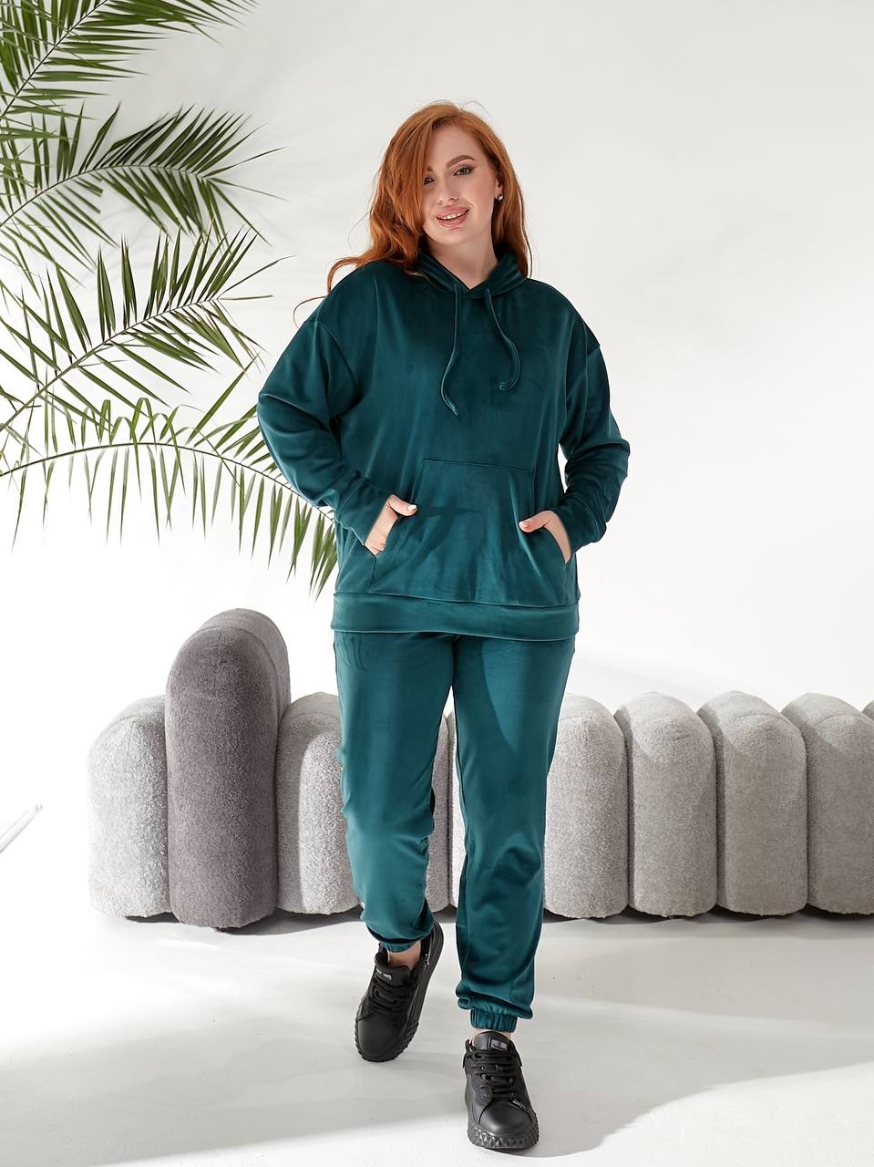 Велюровый костюм (кофта с капюшоном+карманом кенгуру+брюки низ на манжете) зеленый
