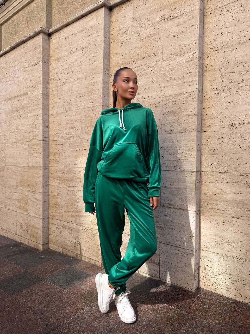 Головна » Магазин » Одяг » Жіночі спортивні костюми » Велюровый костюм (кофта с капюшоном+карманом+брюки манжета на резинке) зеленый