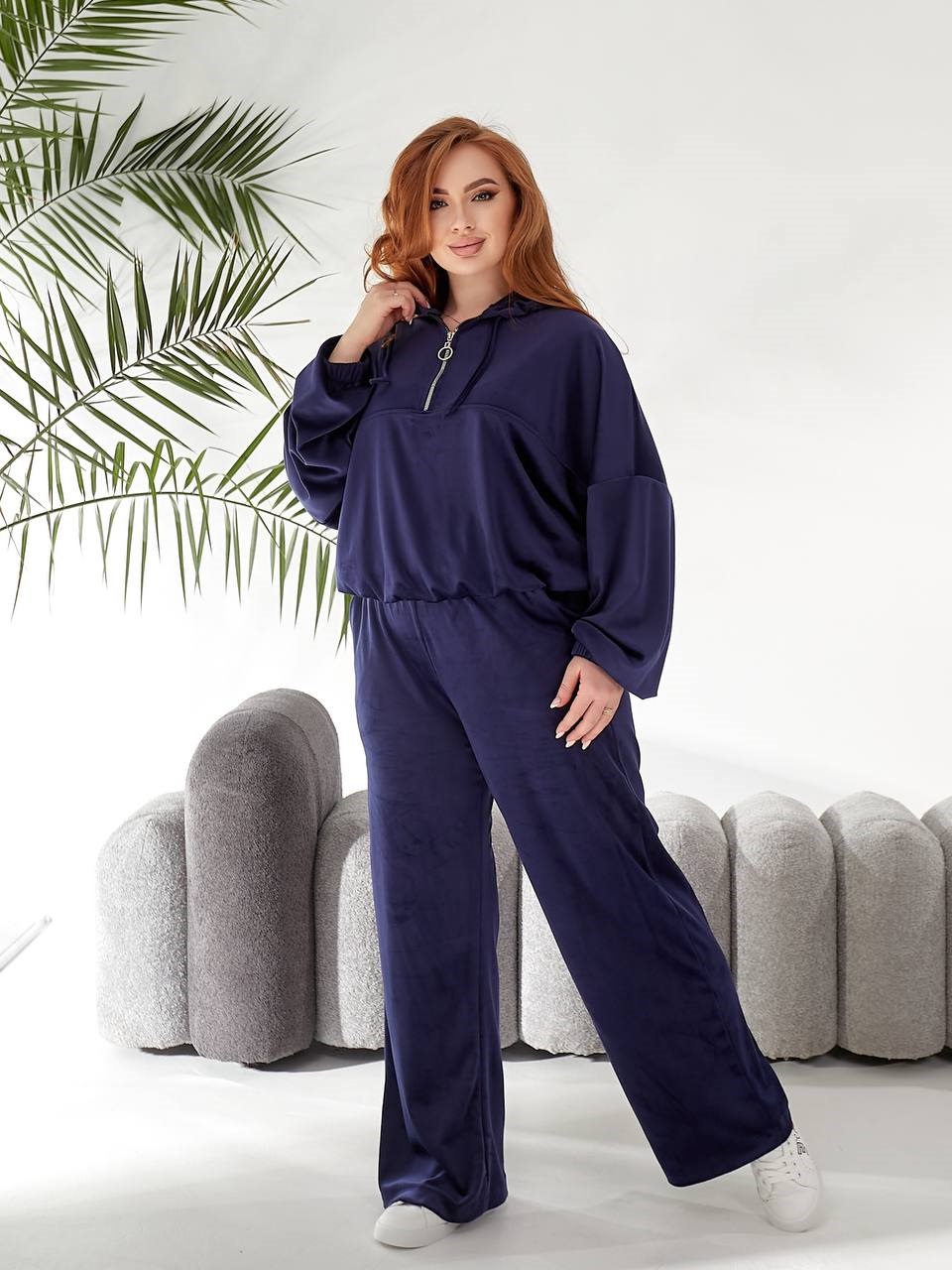 Велюровый костюм (кофта с капюшоном+воротник на молнии+брюки прямого кроя) синий