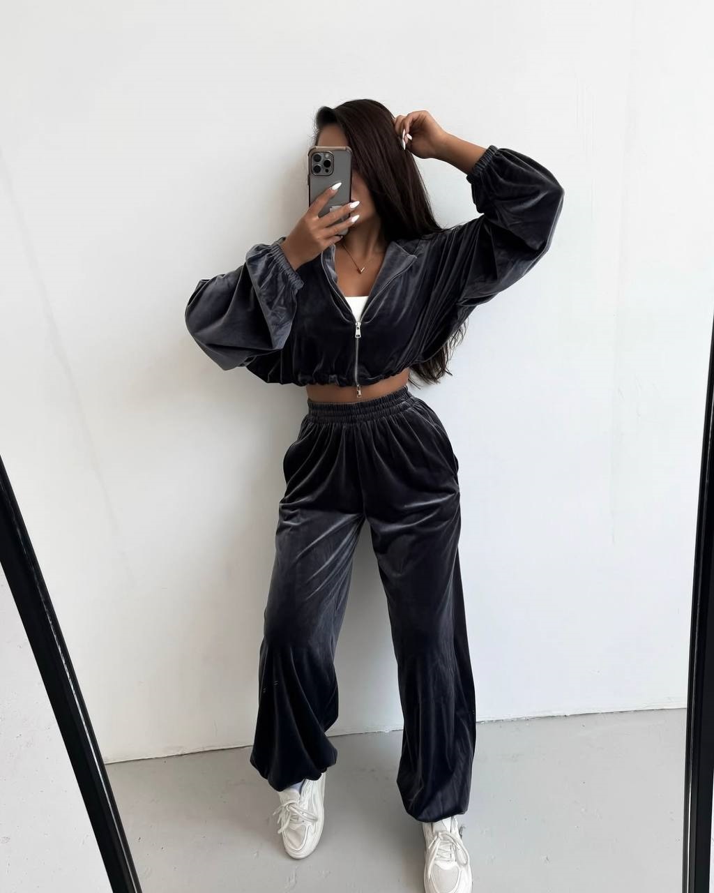 Мягкий и приятный к телу костюм из велюра точно станет вашим любимцем благодаря своей универсальности.