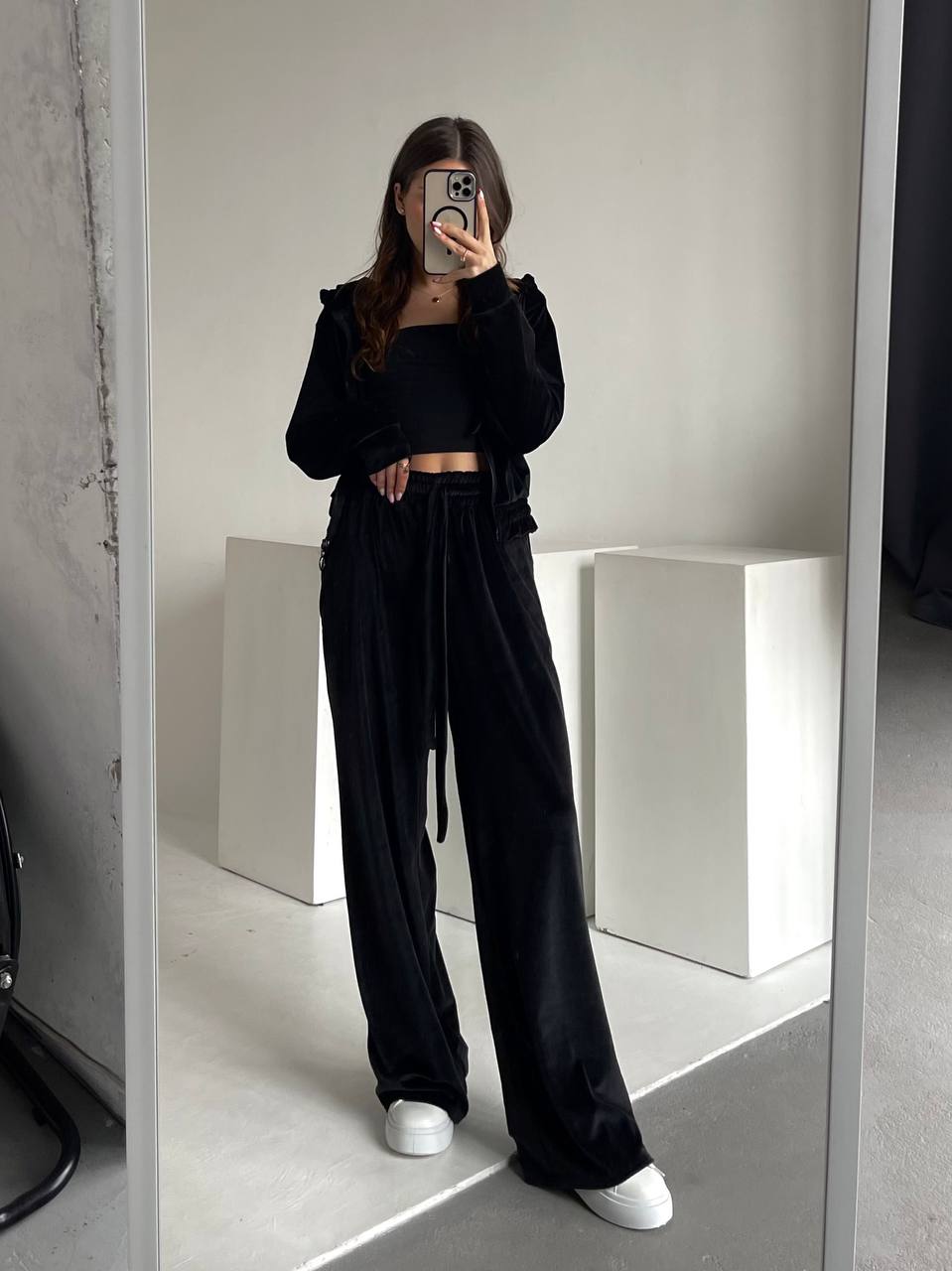 Велюровый костюм оверсайз (зип худи и брюки палаццо) черный