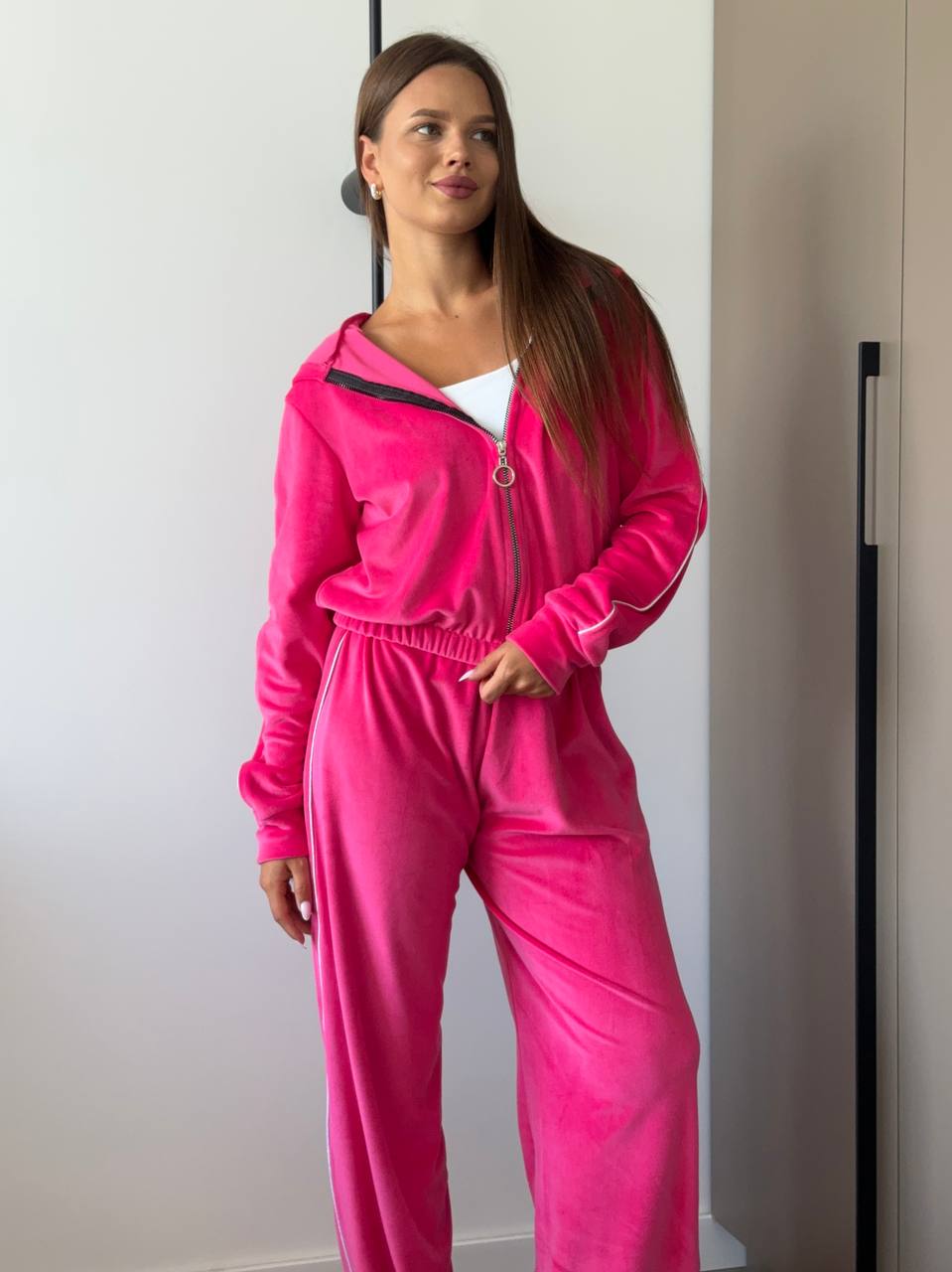 Велюровый костюм с кантом (брюки+кофта на молнии) малина