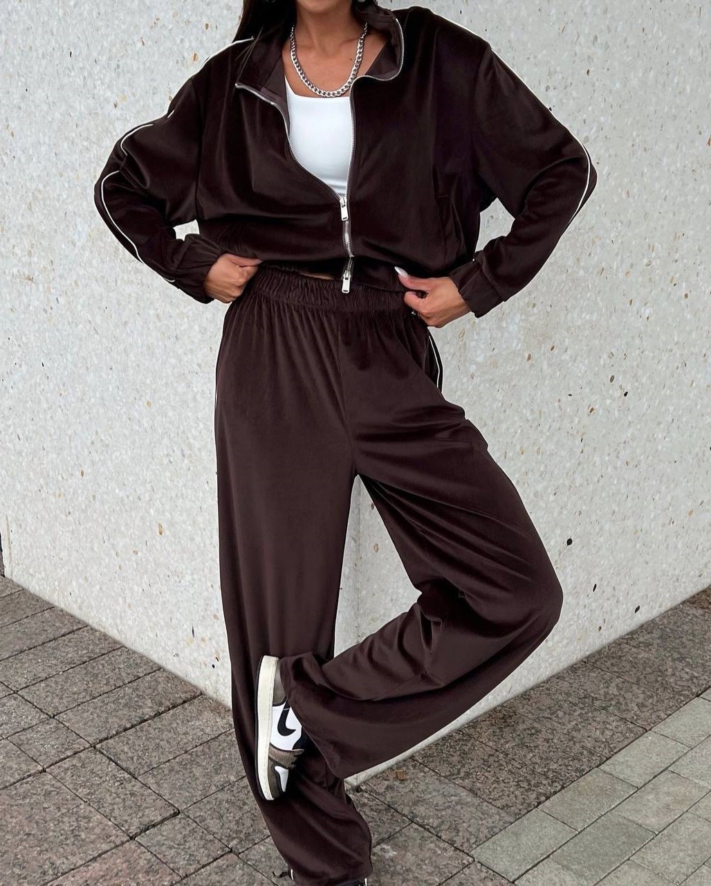 Велюровый костюм с кантом (брюки+кофта на молнии) шоколад