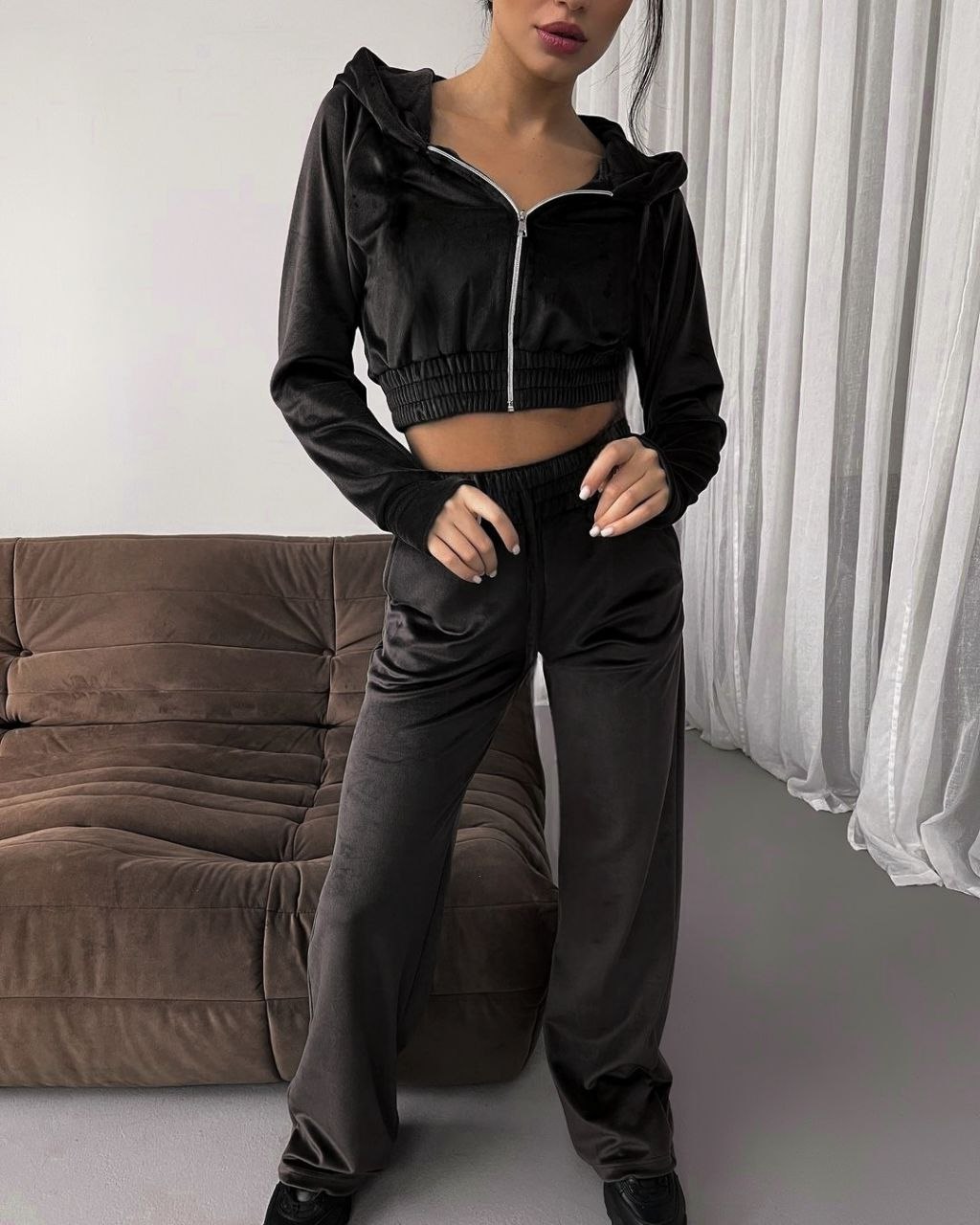 Велюровый костюм с широкими брюками и укороченной кофтой черный