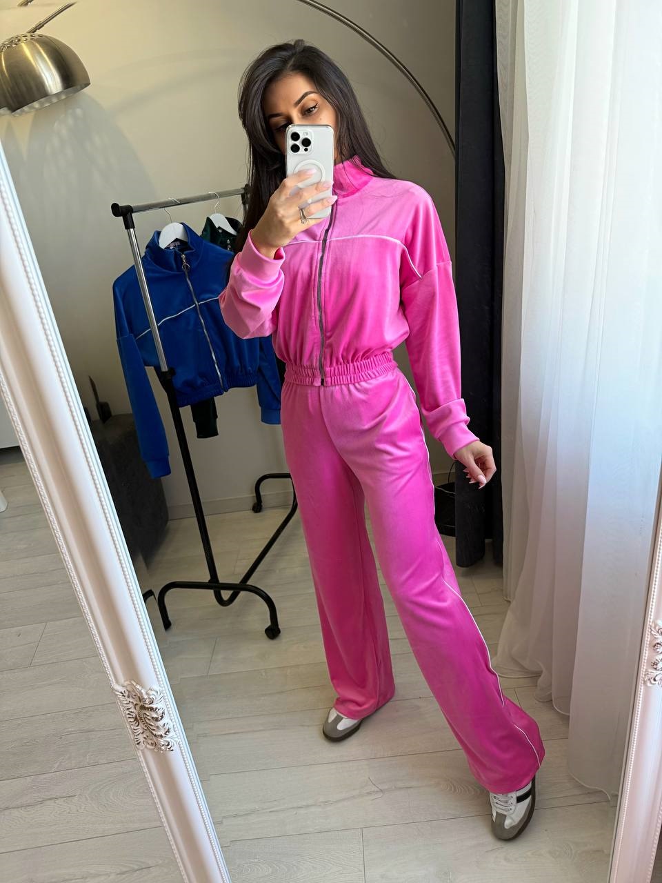 Велюровый костюм со вставкой канта (кофта на молнии+по низу резинка+брюки свободного кроя) розовый
