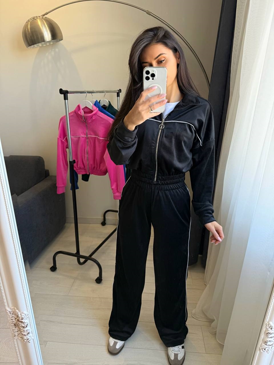 Велюровый костюм со вставкой канта (кофта на молнии+по низу резинка+брюки свободного кроя) черный