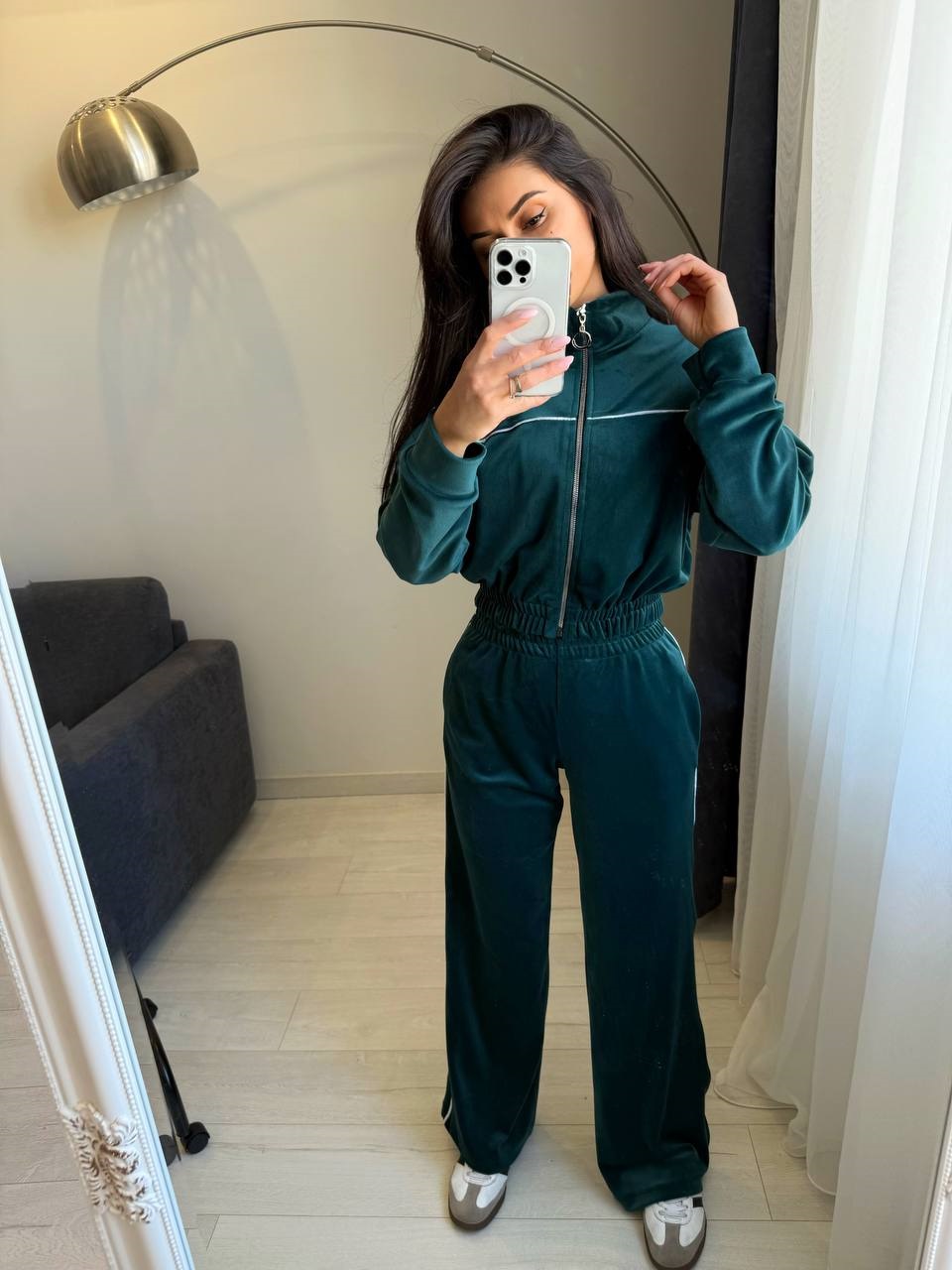 Велюровый костюм со вставкой канта (кофта на молнии+по низу резинка+брюки свободного кроя) зеленый