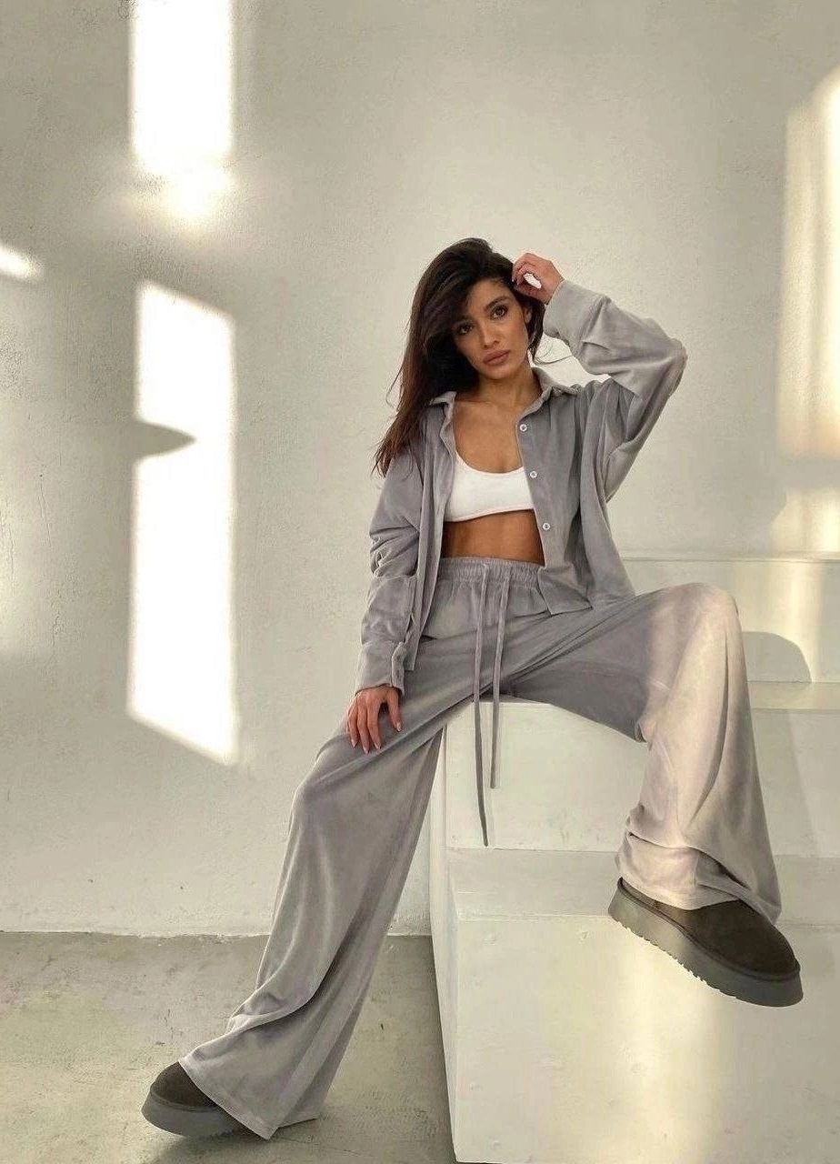 Головна » Магазин » Одяг » Жіночі костюми » Велюровый костюм свободного кроя (кофта на молнии+брюки) серый
