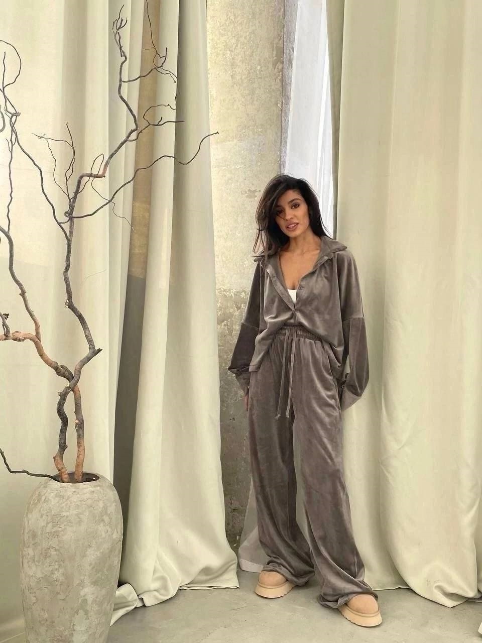 Головна » Магазин » Одяг » Жіночі костюми » Велюровый костюм свободного кроя (кофта на молнии+брюки) мокко