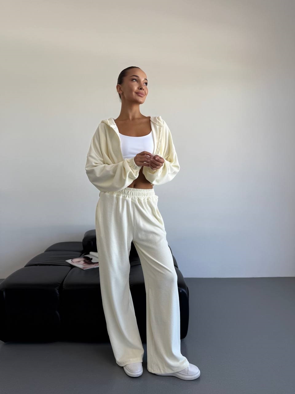 Он состоит из свободных брюк широкого кроя на резинке и оверсайз худи на молнии с капюшоном.
