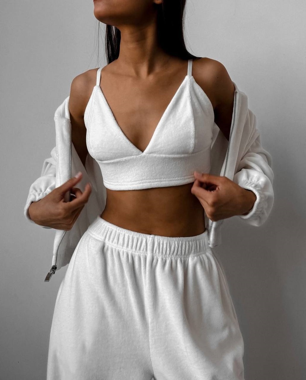 Велюровый костюм тройка (топ+кофта+брюки) молочный