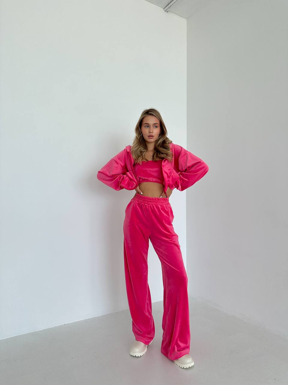 Головна » Магазин » Одяг » Жіночі костюми » Велюровый костюм (укороченная кофта с капюшоном+топ+свободные брюки) розовый