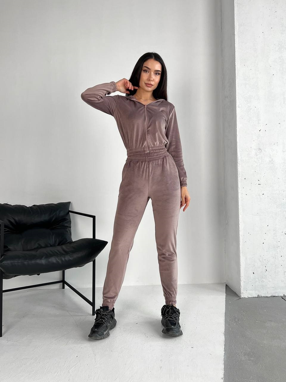 Велюровый костюм (укороченная кофта с капюшоном+штаны низ на резинке) капучино