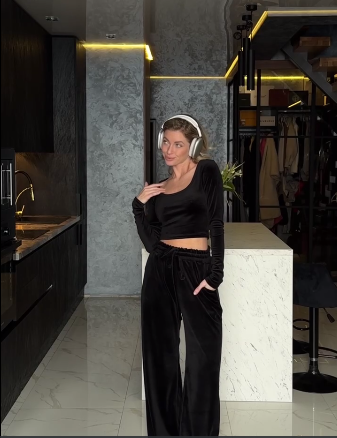 Головна » Магазин » Одяг » Жіночі спортивні костюми » Велюровый костюм (укороченная кофточка с круглой глубокой горловиной+свободные брюки) черный
