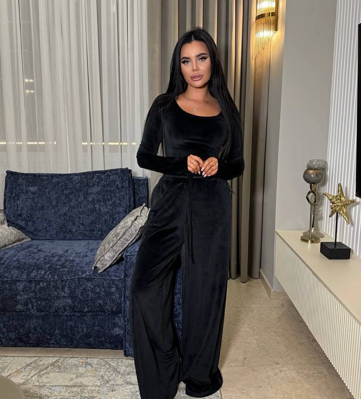 Велюровый костюм: укороченный лонгслив с длинными рукавами и брюки свободного кроя черный