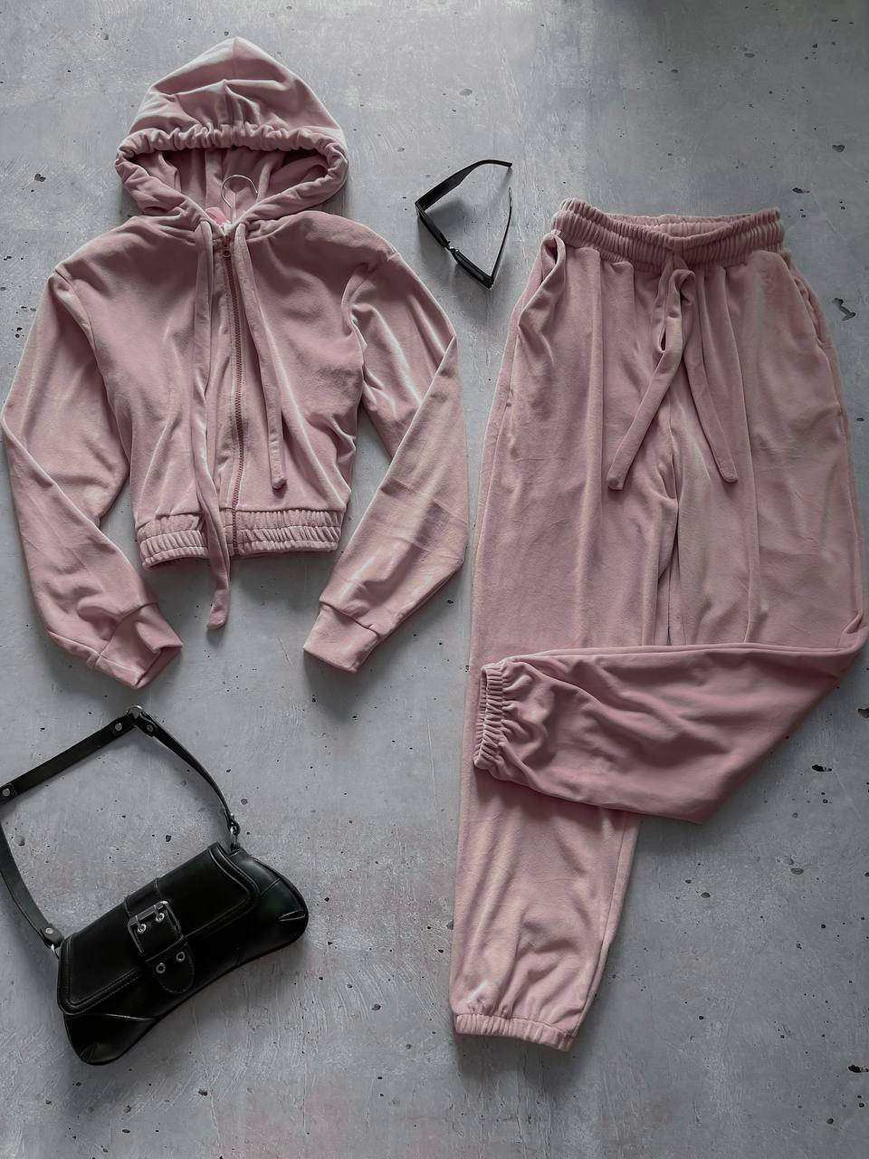 Велюровый оверсайз костюм (джоггеры с высокой посадкой+укороченная кофта свободного кроя) пудра