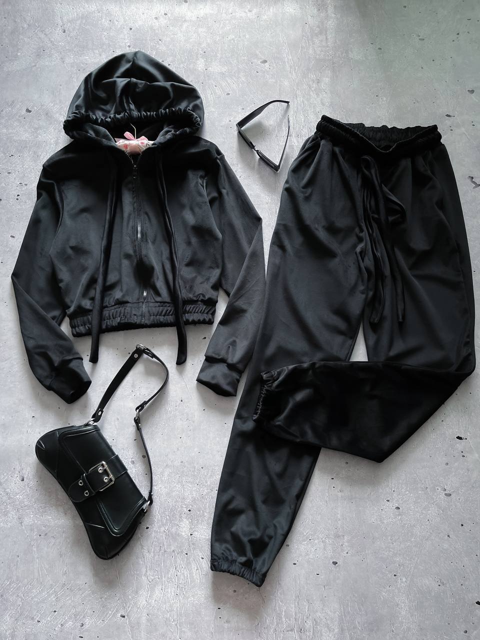 Джоггеры с высокой посадкой; укороченная зип кофта свободного кроя с тракторной молнией, спущена линия плеча,