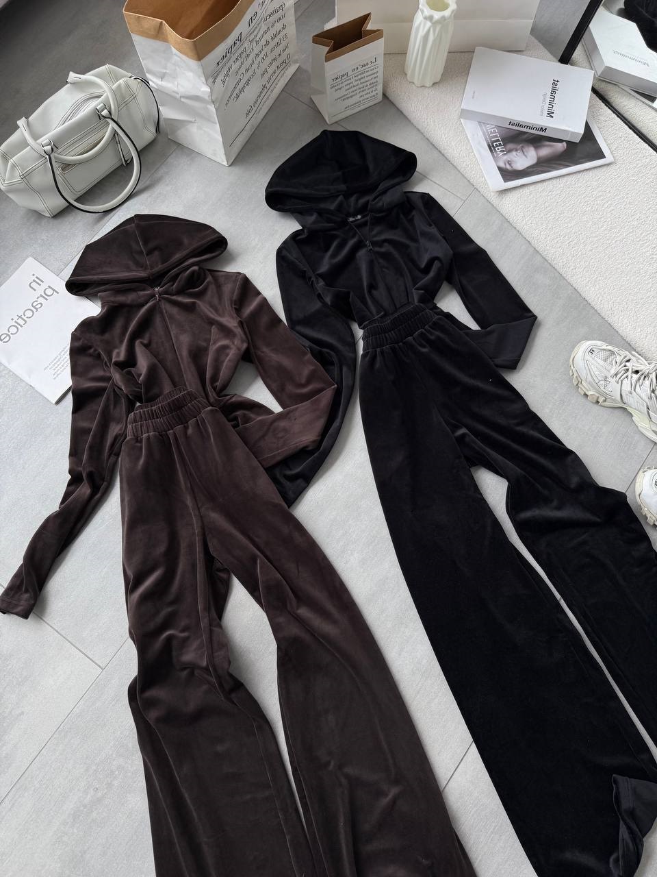 Велюровый плюшевый костюм (кофта с капюшоном на молнии+брюки высокая посадка) черный