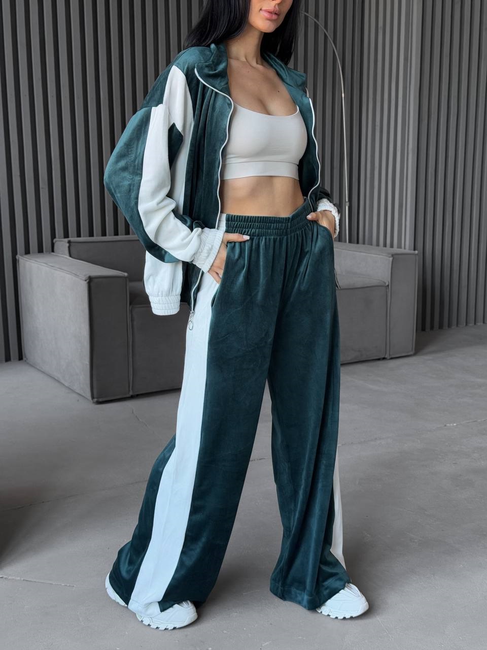 Будьте першим, хто залишив відгук “Велюровый спортивный костюм свободного кроя с контрастными молочными полосами изумруд”“