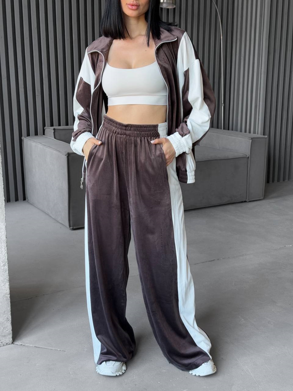 Велюровый спортивный костюм свободного кроя с контрастными молочными полосами шоколад