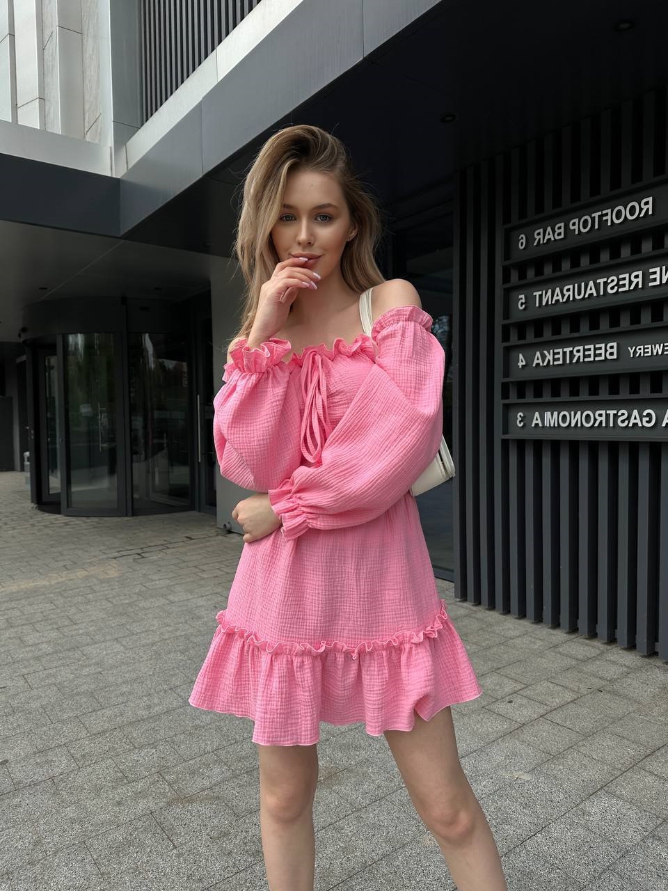 Воздушное легкое платье с воланом по низу юбки+пышными рукавами+резинкой по горловине розовый