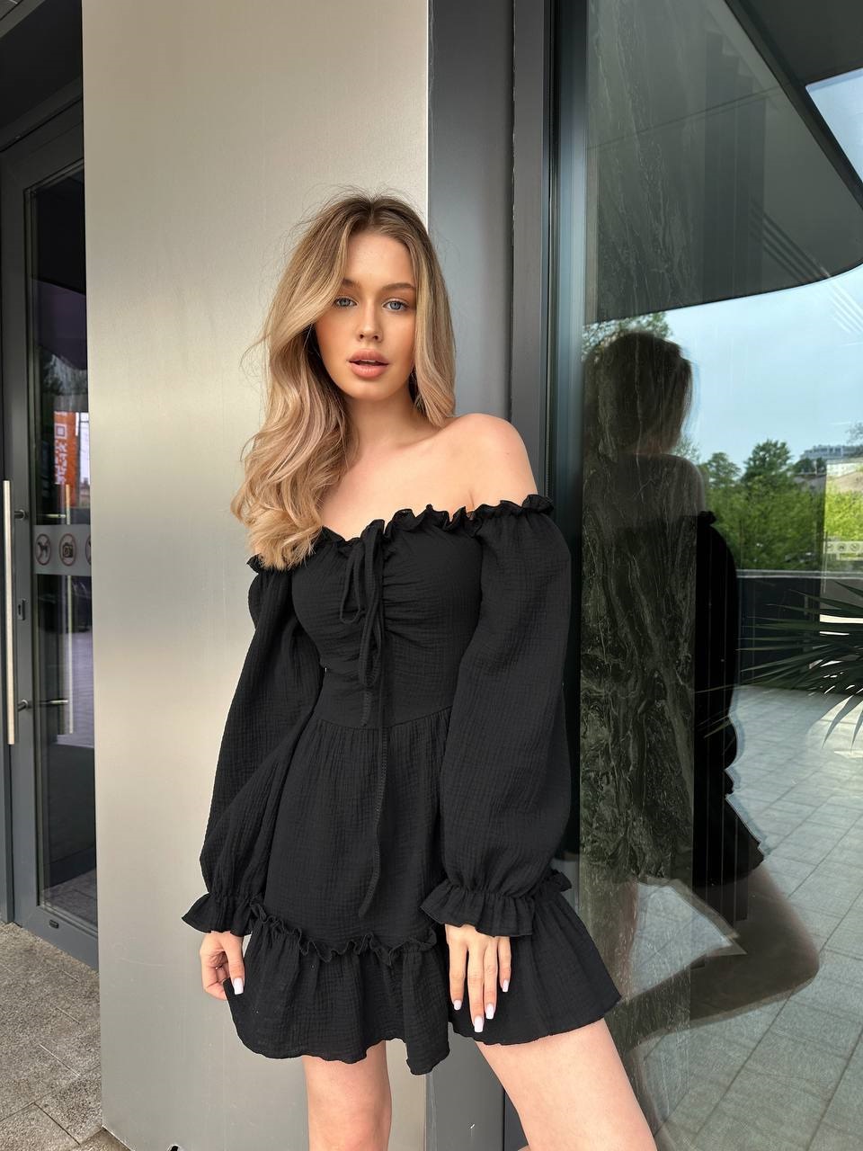 Воздушное легкое платье с воланом по низу юбки+пышными рукавами+резинкой по горловине черный