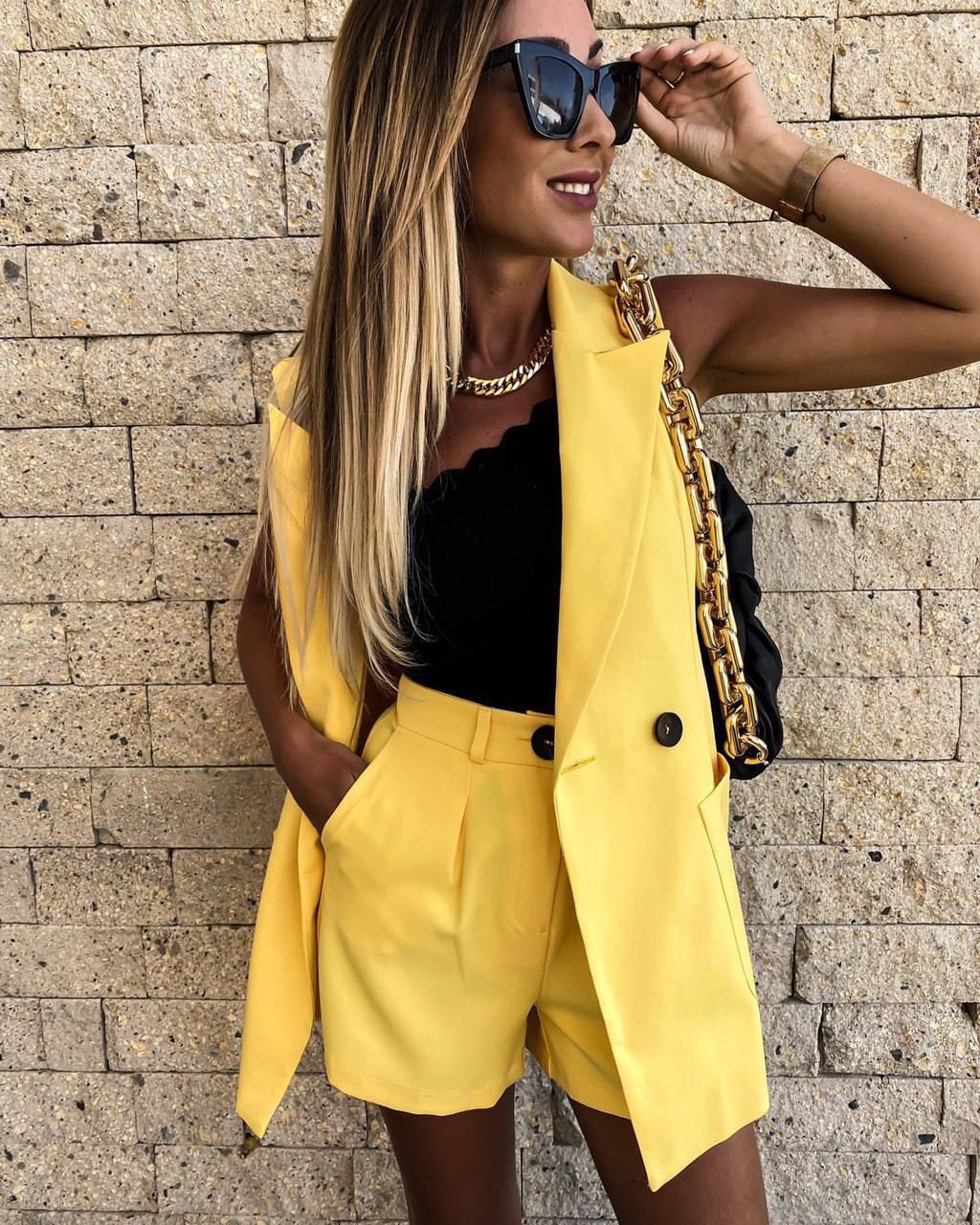 Яркий летний костюм: удлиненный жилет + шорты желтый