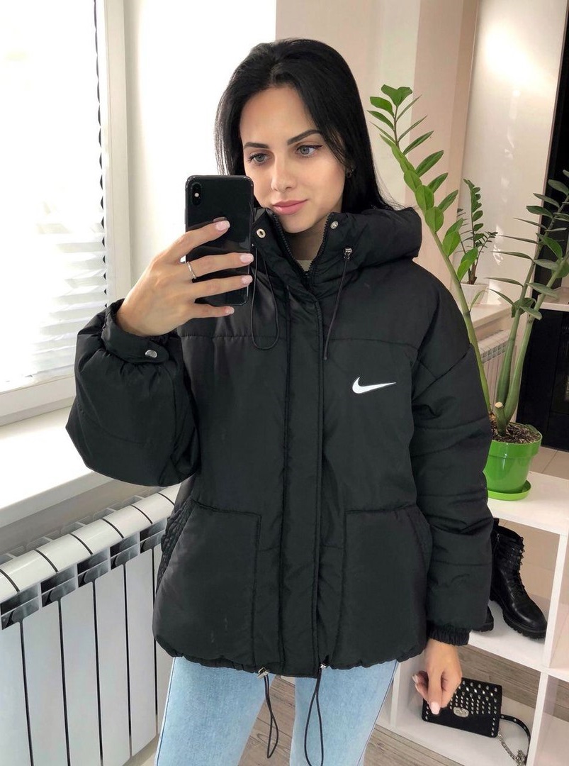Модель имеет два кармана, молнию, кнопки и капюшон.