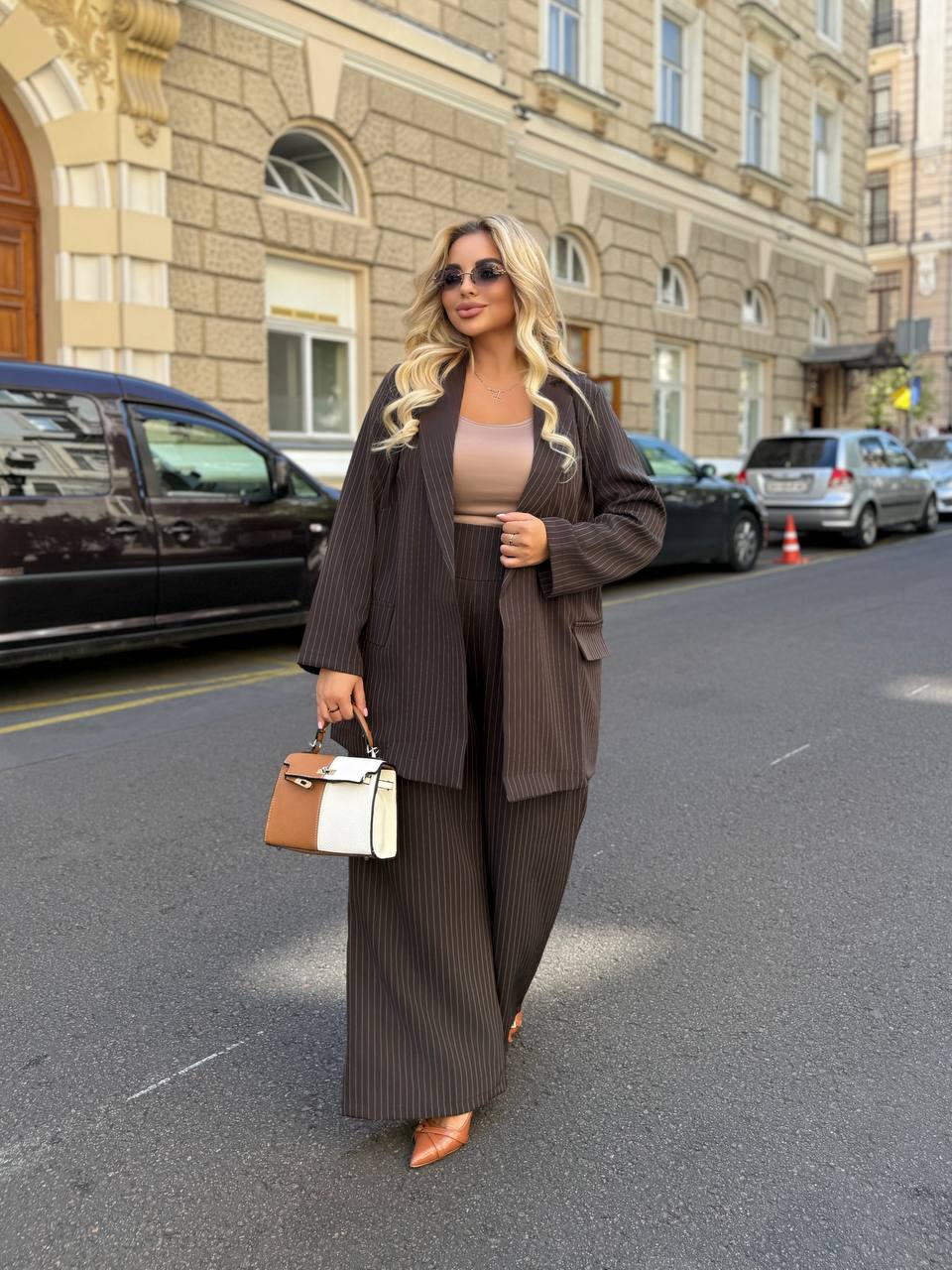 Женский брючный костюм: брюки сзади на резинке+пиджак без подкладки шоколад