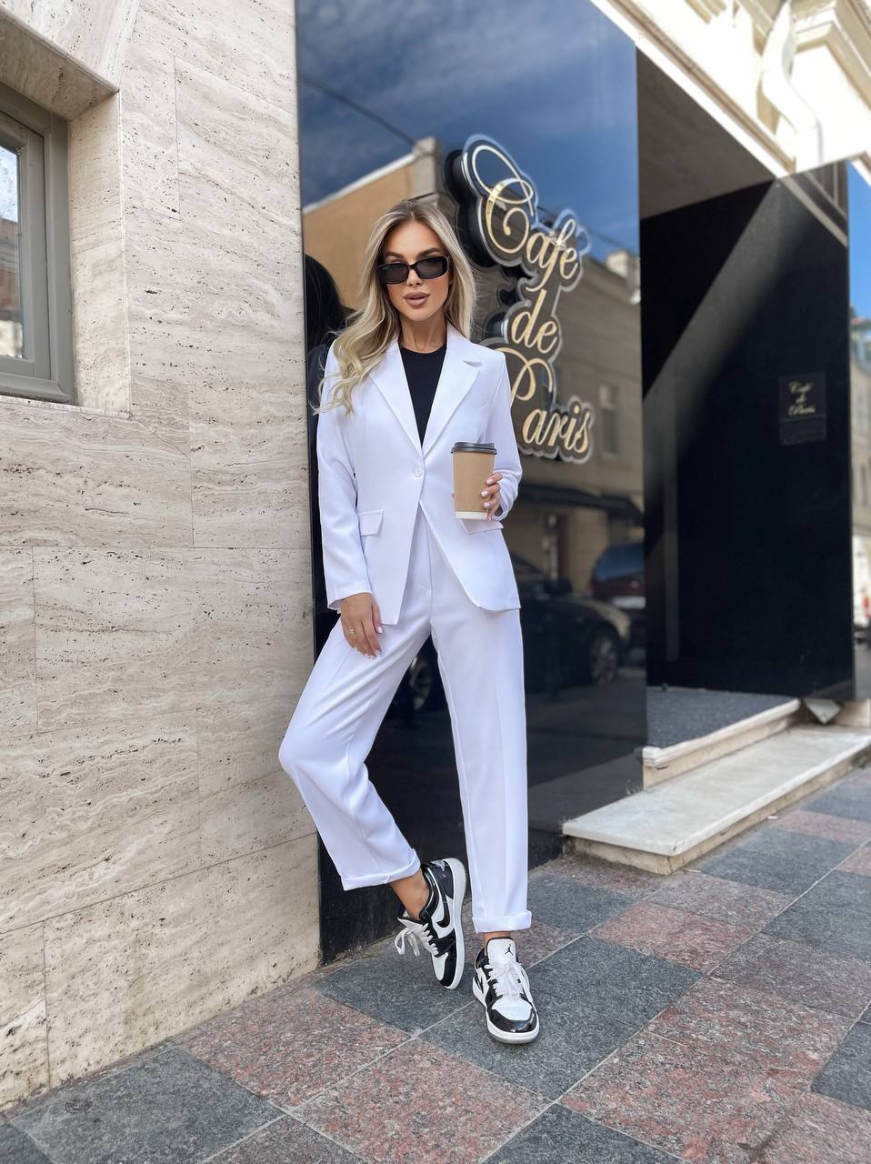 Женский брючный костюм (пиджак на пуговице+брюки) белый