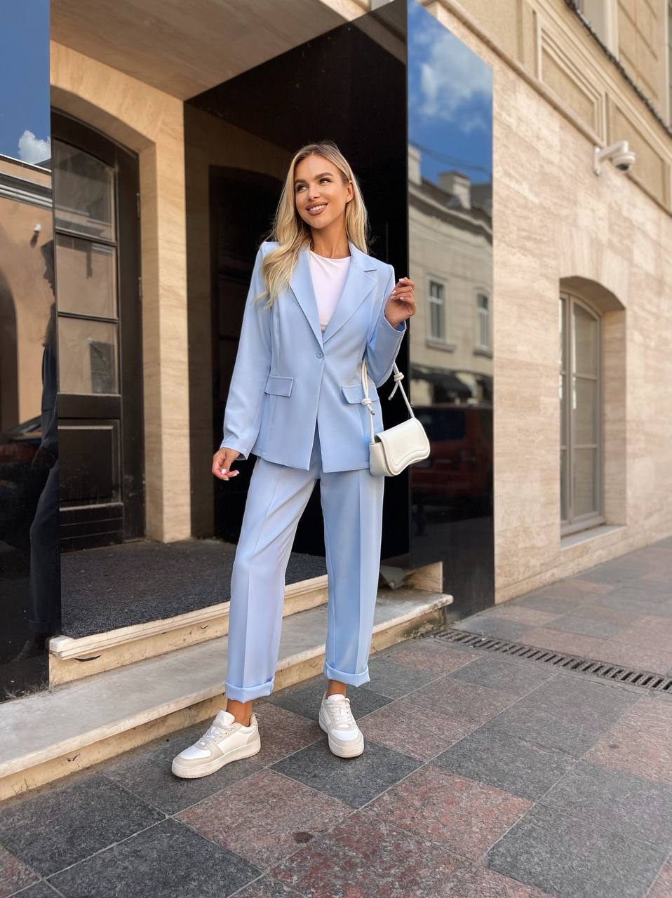 Женский брючный костюм (пиджак на пуговице+брюки) голубой