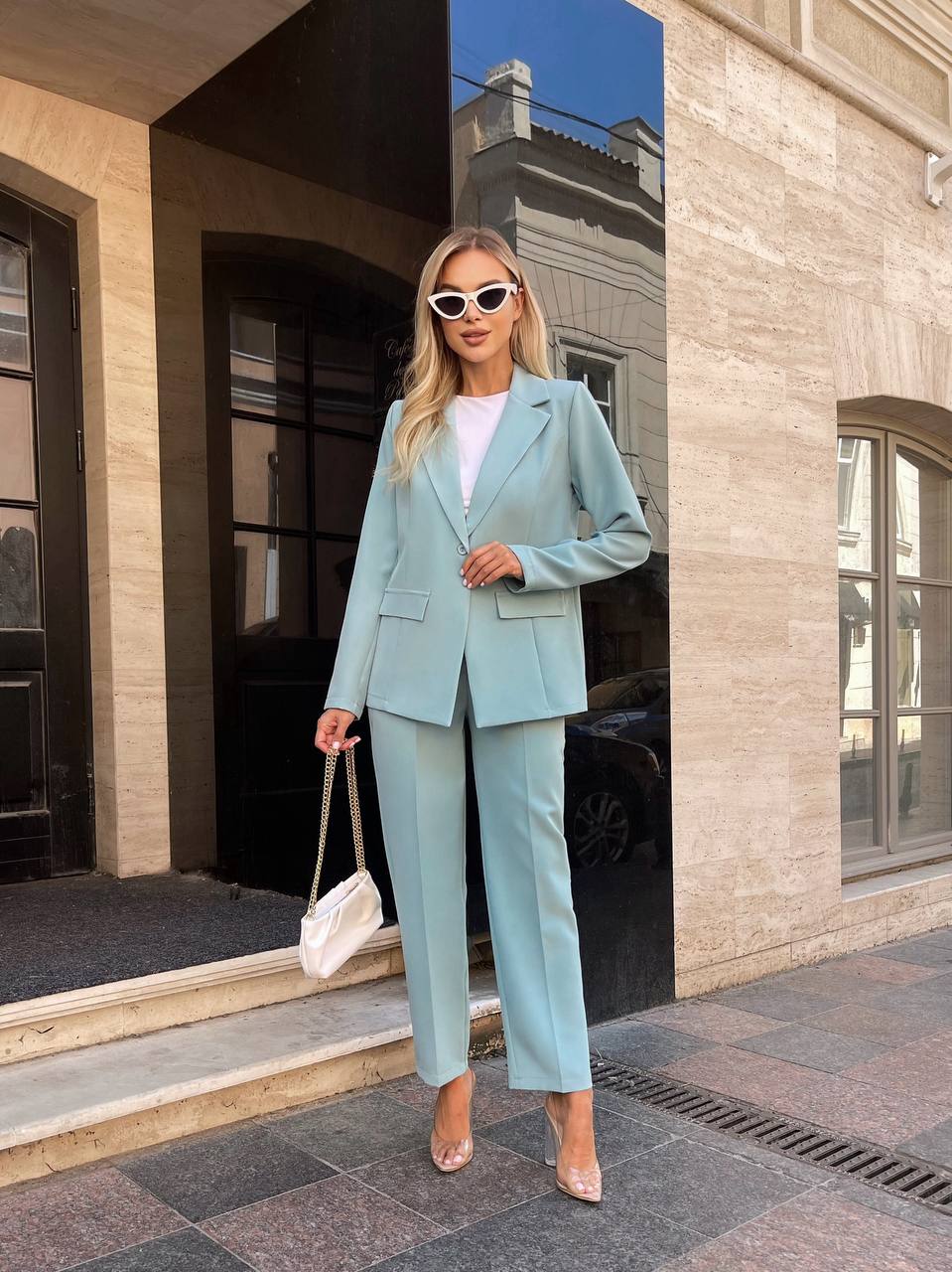 Женский брючный костюм (пиджак на пуговице+брюки) оливка
