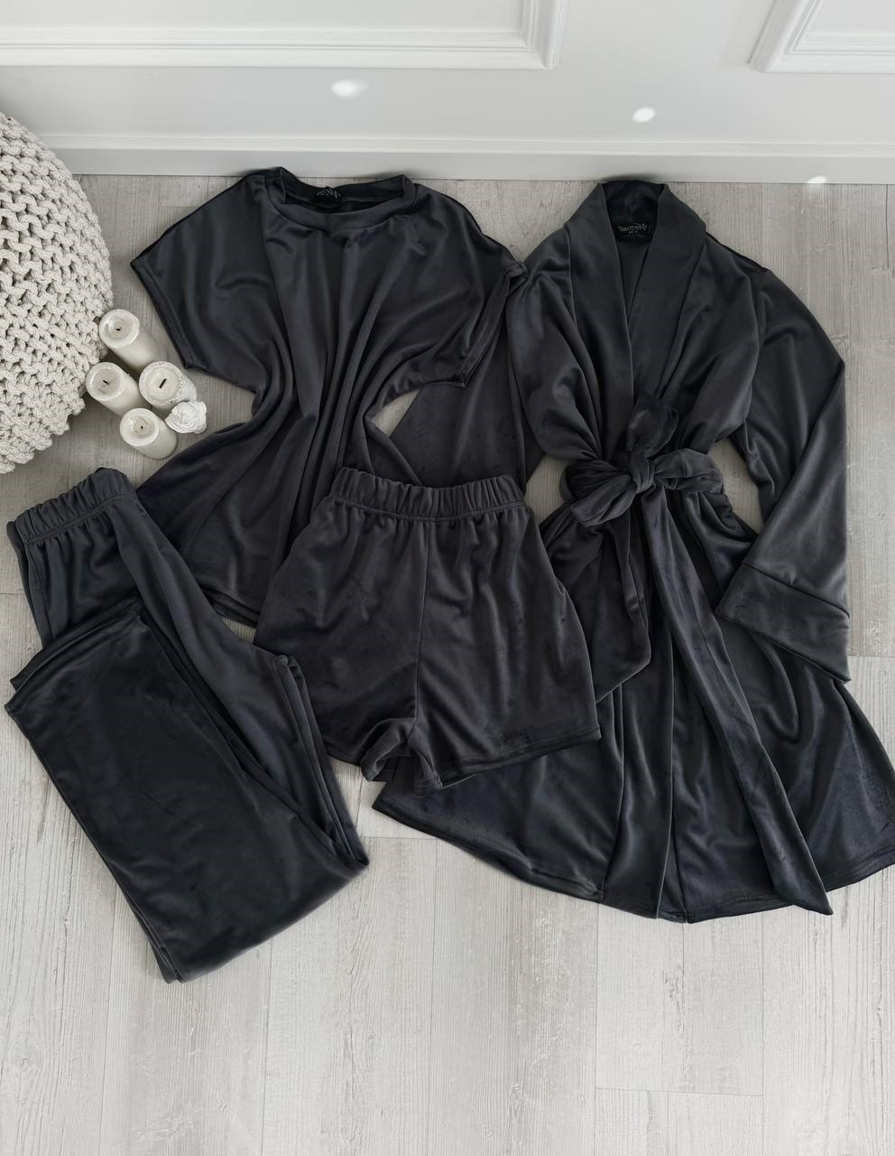 Женский комплект четвёрка из плюша (халат+шорты+футболка+брюки) графит