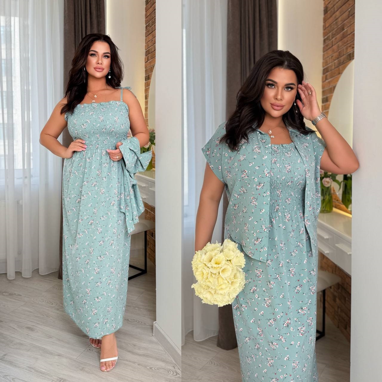 Женский комплект: сарафан с настроченой резинкой по груди+блуза хаки
